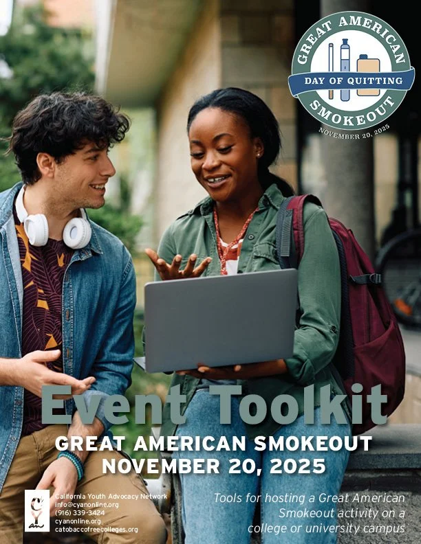 CYAN provides free resources to California colleges and universities interested in hosting campus events to motivate and support students and campus community members in quitting tobacco. Resources include quit kits, print educational and cessation materials, and tools to generate ideas for on-campus events and activities.